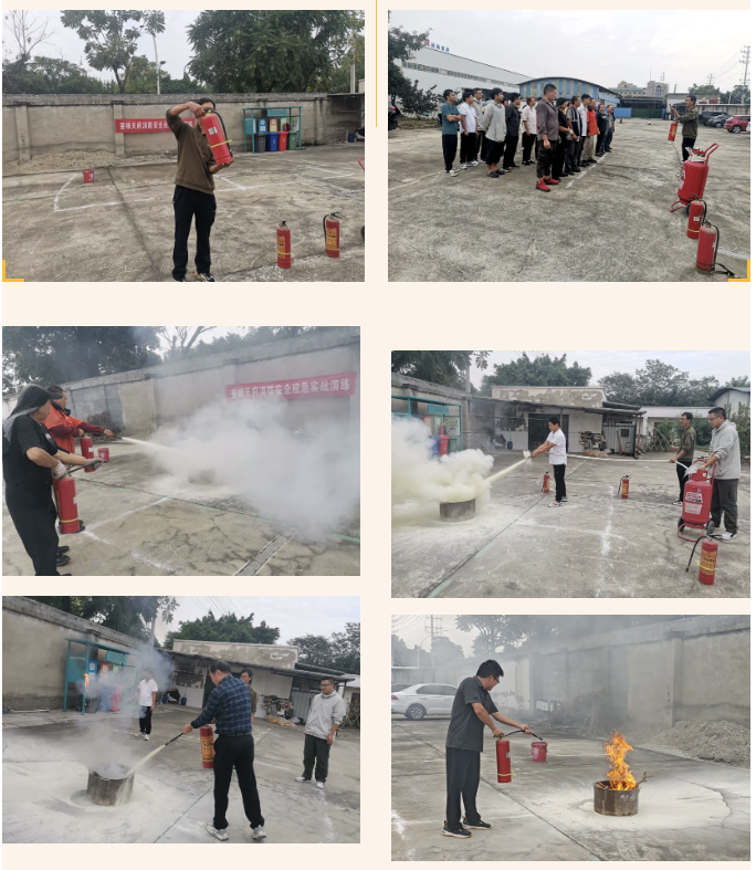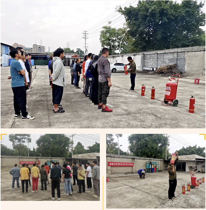 实战演练环节模拟了公司院坝与仓库车间突发火情的应急处置流程。在总指挥周琦的统一调度与现场指挥瞿洪的协调下,各应急小组分工明确、响应迅速。疏散组引导员工有序撤离至安全区域,后勤组保障物资与医疗支持,摄影组全程记录演练过程。随后,参训员工在指导下进行了灭火器实操训练,学习掌握扑救初期火灾的基本技能,切实提升“小火会灭、大火会逃”的实战能力。